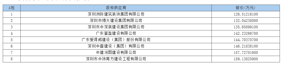 投標(biāo)單位(A包): 供應(yīng)商名稱:深圳市博大建設(shè)集團有限公司; 供應(yīng)商名稱:深圳市中深裝建設(shè)集團有限公司; 供應(yīng)商名稱:廣東愛得威建設(shè)(集團)股份有限公司;